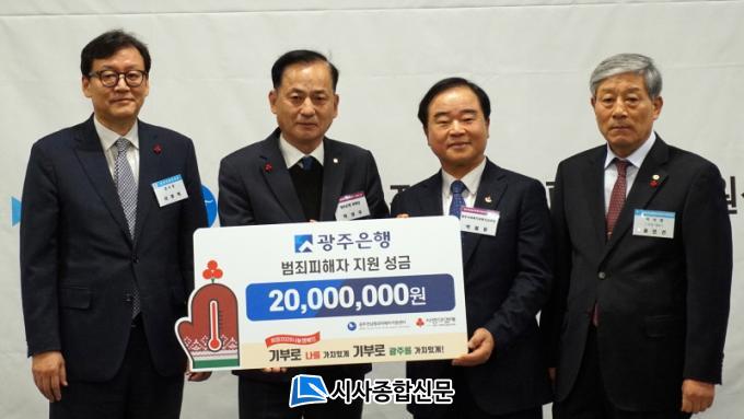 À̹ø ¼º±Ý Àü´Þ½Ä¿¡´Â ±¤ÁÖÀºÇà ¹Ú¼º¿ì ºÎÇàÀå°ú ÀÌÁ¾Çõ ±¤ÁÖÁö¹æ°ËÂûû °Ë»çÀå, À±º¸¼± ±¤ÁÖÀü³²¹üÁËÇÇÇØÀÚÁö¿ø¼¾ÅÍ ÀÌ»çÀå, ¹Úöȫ ±¤ÁÖ»çȸº¹Áö°øµ¿¸ð±ÝȸÀå µîÀÌ Âü¼®ÇßÀ¸¸ç, Àü´ÞµÈ ¼º±ÝÀº ±¤ÁÖ»çȸº¹Áö°øµ¿¸ð±Ýȸ¸¦ ÅëÇØ ±¤ÁÖ¡¤Àü³² Áö¿ªÀÇ ¹üÁË ÇÇÇØÀÚ¸¦ À§ÇÑ ÈÄ¿ø±ÝÀ¸·Î »ç¿ëµÉ ¿¹Á¤ÀÌ´Ù.