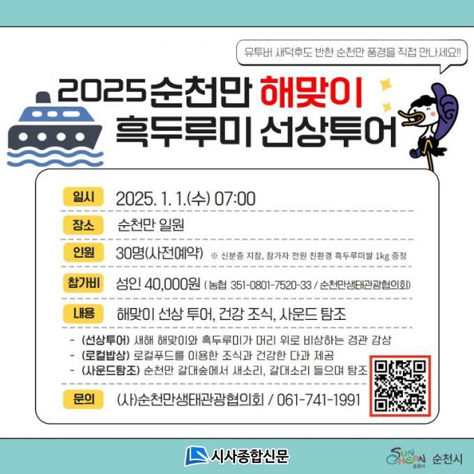 ¼øÃµ½Ã(½ÃÀå ³ë°ü±Ô)´Â 2025³â À»»ç³â »õÇØ¸¦ ¸Â¾Æ 1¿ù 1ÀÏ ¼øÃµ¸¸½ÀÁö¿¡¼ ¡®¼øÃµ¸¸ »õÇØ ¼±»ó ÇØ¸ÂÀÌ¡¤ÈæµÎ·ç¹Ì ŽÁ¶ Ưº°ÇÁ·Î±×·¥¡¯À» (»ç)¼øÃµ¸¸»ýŰü±¤ÇùÀÇȸ¿Í ÇÔ²² ¿î¿µÇÑ´Ù°í ¹àÇû´Ù.