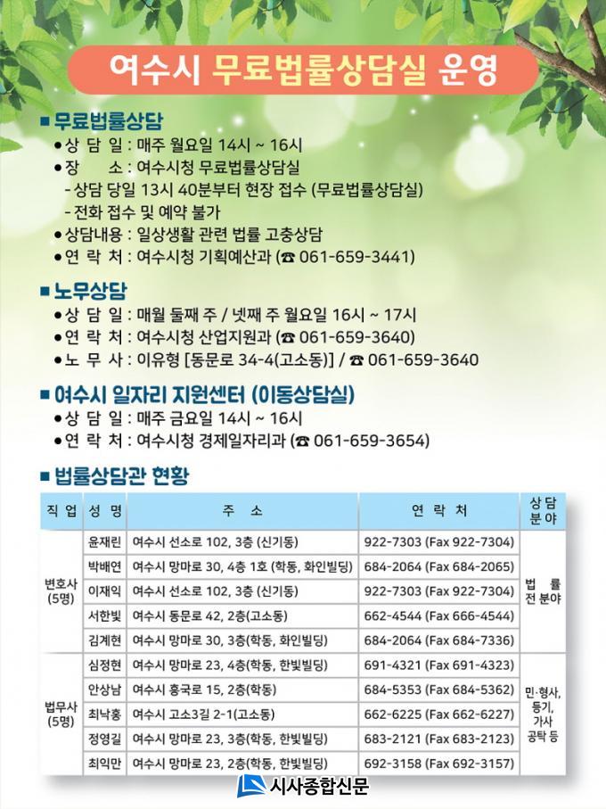¿©¼ö½Ã´Â ÇØ¸¶´Ù ¹«·á¹ý·ü»ó´ã½ÇÀ» ¿î¿µÇϰí ÀÖÀ¸¸ç, Áö³ 2ÀÏ¿¡´Â º¯È£»ç 5¸í°ú ¹ý¹«»ç 5¸íÀ» 2025³â ¹«·á¹ý·ü»ó´ã°üÀ¸·Î À§ÃËÇß´Ù.