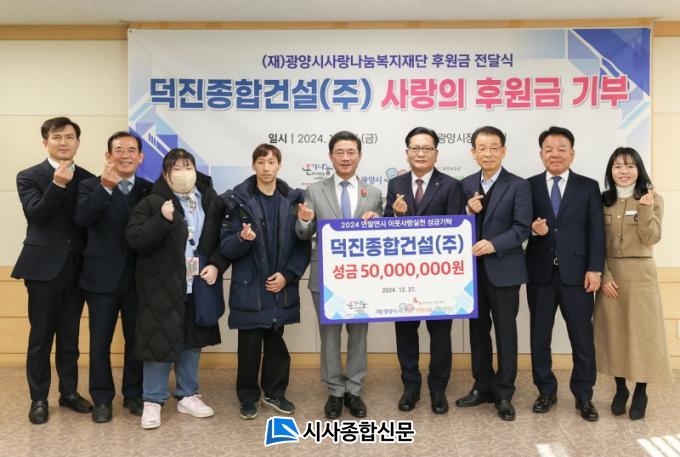 [½Ã»çÁ¾ÇսŹ® = Àå¹Î±Ô ±âÀÚ] ±¤¾ç½Ã´Â Áö³ 12¿ù 27ÀÏ ´öÁøÁ¾ÇհǼ³(ÁÖ)(´ëÇ¥ÀÌ»ç ±è¼ºÀº)¿¡¼ (Àç)±¤¾ç½Ã»ç¶û³ª´®º¹ÁöÀç´Ü(ÀÌ»çÀå ±èÀç°æ)¿¡ ¼º±Ý 5õ¸¸ ¿ø, ±¤¾ç½Ã¿¡ °íÇâ»ç¶û±âºÎ±Ý 5¹é¸¸ ¿øÀ» Àü´ÞÇØ ¿¬¸»¿¬½Ã Áö¿ª»çȸ¿¡ ¶æ±íÀº ³ª´®À» ½ÇõÇß´Ù°í 2ÀÏ ¹àÇû´Ù.