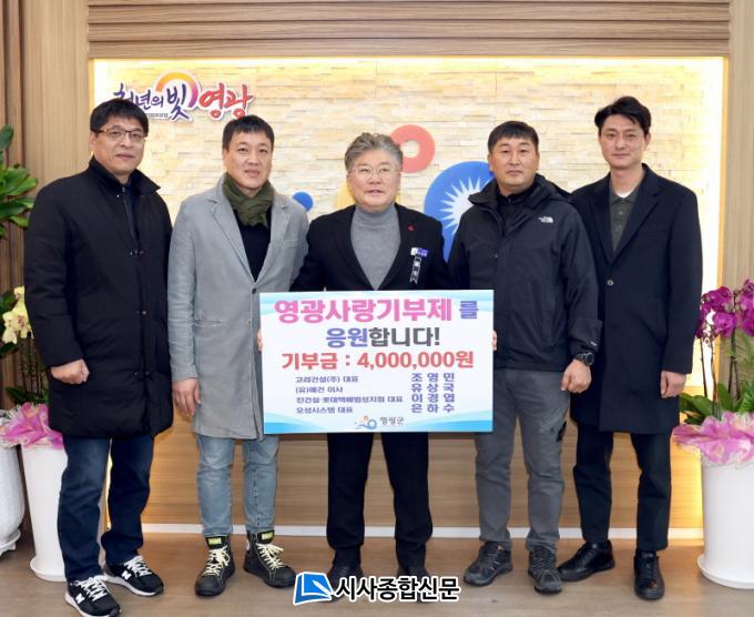 [½Ã»çÁ¾ÇսŹ® = ¿À½ÂÅà ±âÀÚ] Áö³ 7ÀÏ ¿µ±¤±º ¼ø¼ö ±âºÎ¸ðÀÓ È¸¿ø Á¶¿µ¹Î(°í·Á°Ç¼³ÁÖ½Äȸ»ç ´ëÇ¥), À¯»ó±¹(À¯ÇÑȸ»ç ¿¹°Ç ÀÌ»ç), À̰濱(Áø°Ç¼³¡¤·Ôµ¥Åùè¹ý¼ºÁöÁ¡ ´ëÇ¥), ÀºÇϼö(¿À¼º½Ã½ºÅÛ ´ëÇ¥) 4¸íÀÌ °íÇâ»ç¶û±âºÎ±Ý 400¸¸ ¿ø(°¢ 100¸¸ ¿ø)À» ¿µ±¤±º¿¡ ±âŹÇÏ¿´´Ù.