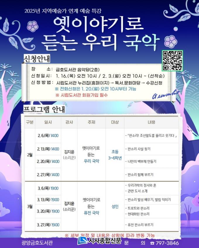 ¿ÃÇØ´Â Çѱ¹±¹¾ÇÇùȸ ±¤¾ç½ÃÁöºÎ ¼Ò¼Ó ¼Ò¸®²ÛÀÌÀÚ ´Ù¾çÇÑ °ø¿¬°ú °¿¬ °æ·ÂÀ» °¡Áö°í ÀÖ´Â ±èÁöÀ± °»ç¸¦ ÃʺùÇØ ¡ãÃʵîÇлýÀ» À§ÇÑ ¡®¿¾À̾߱â·Î µè´Â ¿ì¸® ±¹¾Ç¡¯ °úÁ¤ ¡ã¼ºÀÎÀ» À§ÇÑ ¡®Ç»Àü ±¹¾Ç¡¯ °úÁ¤µî ¸ÂÃãÇü Ư°À¸·Î ±¹¾ÇÀÇ ¸Å·ÂÀ» ÀüÇÒ ¿¹Á¤ÀÌ´Ù.