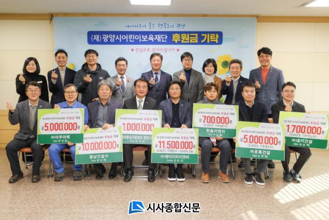 ±âºÎ±Ý Àü´Þ½Ä¿¡´Â Àü³²µå·¡°ïÁî ±è±ÔÈ« ´ëÇ¥¸¦ ºñ·ÔÇØ ±¤¾ç½Ã Á¤ÀÎÈ ½ÃÀå, ±¤¾ç½Ã¾î¸°À̺¸À°Àç´Ü À̱¤¿ë ÀÌ»çÀå°ú ±âºÎ縰Áö Âü¿©±â¾÷ÀÎ ¢ß´ë±â°Ç¼³ ÇÑÀ±Åà ´ëÇ¥, ¢ßÃʷϰǼ³ ¼Õº´¿Ï ´ëÇ¥, ¢ß¿¡ÀÌÄ¡ÇÇÀ̾ؾ¾ ±è¸¸½Ä ºÎ´ëÇ¥, ÇѼÖÀÌ¿£Áö Áö¼øÇü ´ëÇ¥°¡ Âü¼®ÇßÀ¸¸ç, ±âºÎ ±Ý¾×Àº ±âºÎ縰Áö¿¡ Âü¿©ÇÑ ½ÃÁ¡ºÎÅÍÀÎ °ü°è·Î ¢ß´ë±â°Ç¼³°ú ¢ßÃʷϰǼ³Àº °¢ 170¸¸¿ø, ¢ß¿¡ÀÌÄ¡ÇÇÀ̾ؾ¾´Â 150¸¸¿ø, ÇѼÖÀÌ¿£Áö´Â 80¸¸¿øÀÌ´Ù.