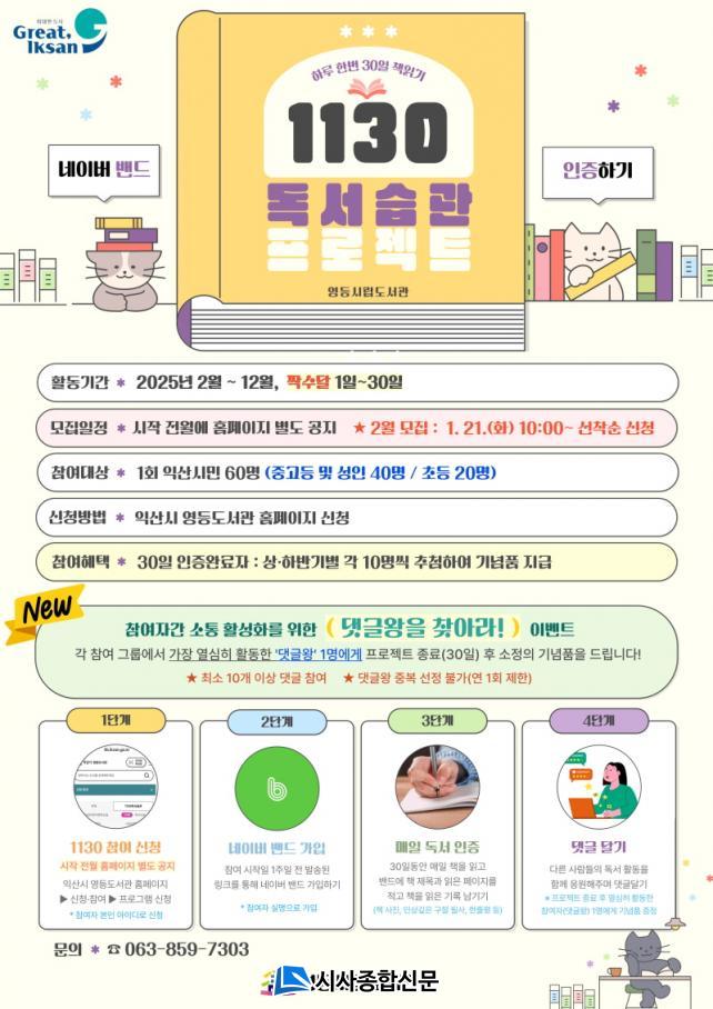 ¿ÃÇØµµ ÃÊ¡¤Áß¡¤°íµîÇлý°ú ¼ºÀÎÀ» ´ë»óÀ¸·Î ÃÑ 6ȸ ¿î¿µÇÒ ¿¹Á¤ÀÌ´Ù. Ȧ¼ö´Þ 25ÀÏ ÀüÈÄ·Î Âü¿©ÀÚ¸¦ ¸ðÁýÇϰí, ¦¼ö´Þ 30ÀÏ µ¿¾È ¿Â¶óÀÎÀ¸·Î µ¶¼ ÀÎÁõÀ» ÁøÇàÇÑ´Ù. 2¿ù Âü¿© ½ÅûÀº ¿µµîµµ¼°ü ´©¸®Áý(lib.iksan.go.kr/yd)¿¡¼ °¡´ÉÇϸç ÀÌ´Þ 21ÀϺÎÅÍ ¼±Âø¼øÀ¸·Î ¸ðÁýÇÑ´Ù. ´õ¿í ÀÚ¼¼ÇÑ ³»¿ëÀº ÀÍ»ê½Ã ÅëÇÕµµ¼°ü ´©¸®ÁýÀ» Âü°íÇÏ¸é µÈ´Ù.