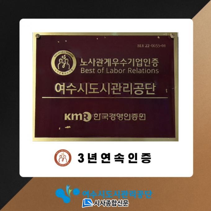 | ¿©¼ö½Ãµµ½Ã°ü¸®°ø´Ü, ³ë»ç°ü°è ¿ì¼ö±â¾÷ 3³â ¿¬¼Ó ÀÎÁõ ȹµæ |