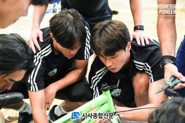 À̳¯ Àü´ÞÇÑ ±âºÎǰÀÇ ÀÚÀü°Å´Â ¼±¼ö´Ü ¿öÅ©¼¥À» ÅëÇØ ¼±¼öµéÀÌ Á÷Á¢ Á¶¸³ÇÏ°í ¿Ï¼ºÇÏ¿© ¸¸µç ¡¯Made by Jeonbuk hyundai¡¯ ÀÛǰÀ̾ú´Ù.