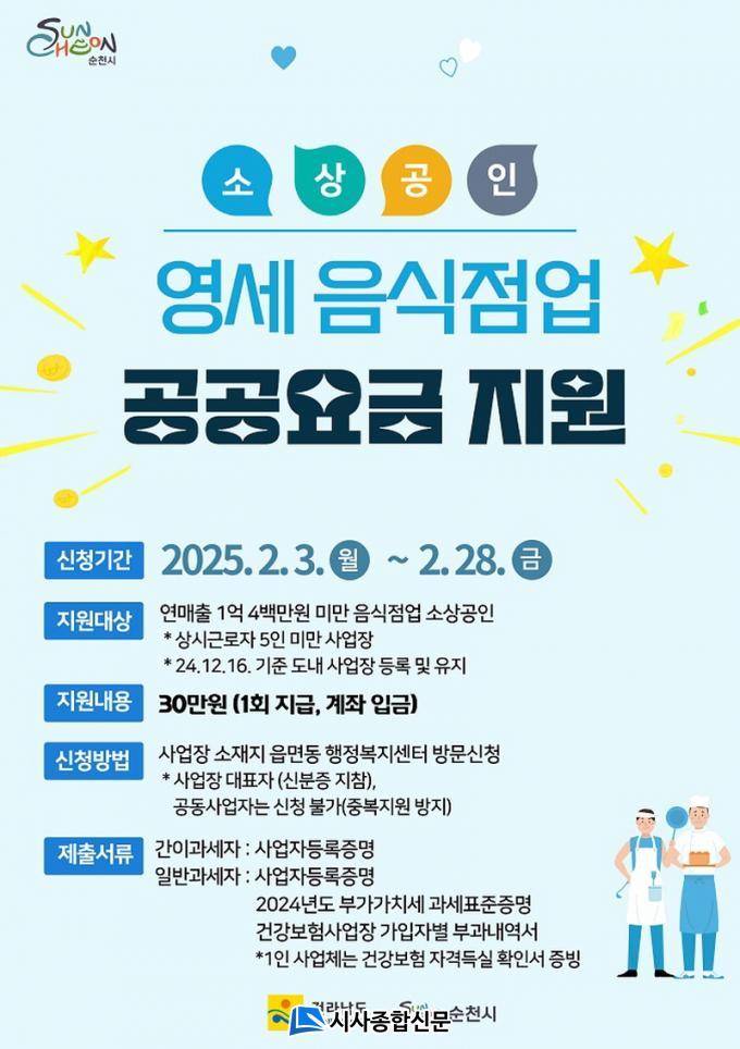 Áö¿ø ´ë»óÀº 2024³â 12¿ù 16ÀÏ ±âÁØ ¼øÃµ½Ã¿¡ »ç¾÷ÀåÀ» µÎ°í ¿î¿µ ÁßÀÎ À½½ÄÁ¡¾÷ ¼Ò»ó°øÀÎÀ¸·Î, ¿¬¸ÅÃâ 1¾ï 4¹é¸¸ ¿ø ¹Ì¸¸ÀÌ¸é¼ »ó½Ã±Ù·ÎÀÚ ¼ö 5ÀÎ ¹Ì¸¸ÀÎ »ç¾÷À常 ÇØ´çµÈ´Ù. À¯ÈïÁÖÁ¡ ¹× ´Ü¶õÁÖÁ¡ µîÀº Á¦¿ÜµÇ¸ç, Áö¿ø±ÝÀº 1ȸ¿¡ ÇÑÇØ¼ 30¸¸ ¿øÀÌ »ç¾÷Àå ´ëÇ¥ÀÚ ¸íÀÇ °èÁ·ΠÁö±ÞµÈ´Ù.