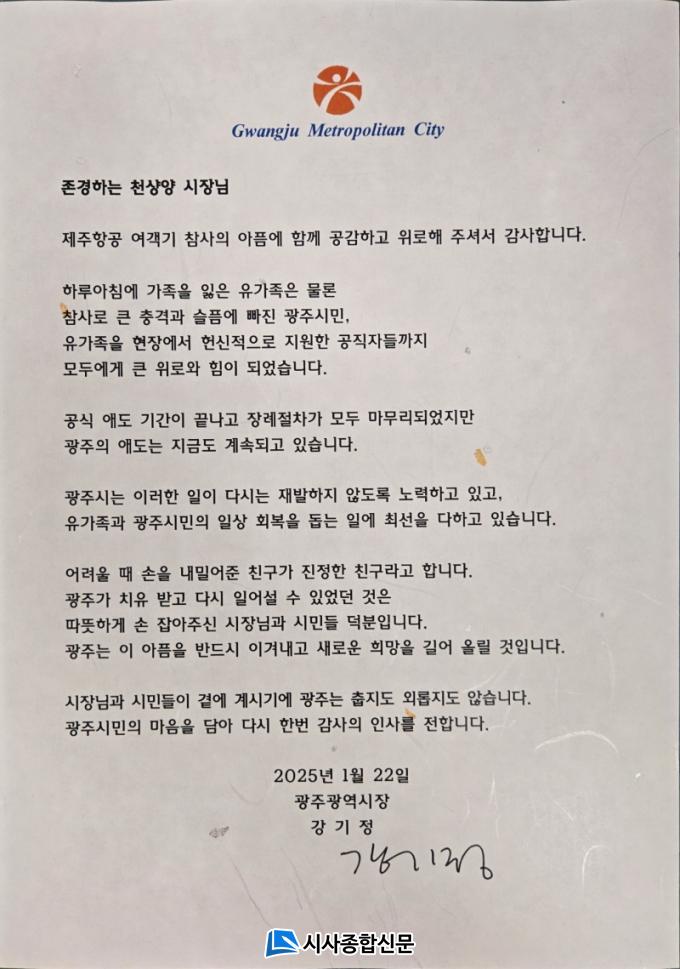 [½Ã»çÁ¾ÇսŹ® = ¿À½ÂÅà ±âÀÚ] ±¤ÁÖ±¤¿ª½Ã(½ÃÀå °±âÁ¤)´Â Á¦ÁÖÇ×°ø ¿©°´±â Âü»ç¿Í °ü·ÃÇØ ¡®¾Öµµ ¼Çѹ®¡¯°ú ±ÙÁ¶ÈȯÀ» º¸³»ÁØ ÇØ¿Ü Àڸš¤¿ìÈ£µµ½Ã, ÁÖÇѿܱ¹°ø°üÀå µî ¼¼°è 50¿© µµ½Ã¡¤±â°ü¿¡ ¡®°¨»ç ¼Çѹ®¡¯À» 22ÀÏ ¹ß¼ÛÇß´Ù.