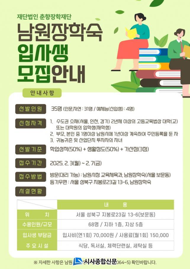 ½Åû ±â°£Àº 2025³â 2¿ù 3ÀϺÎÅÍ 2¿ù 7ÀϱîÁöÀ̸ç, ³²¿ø½Ãû ±³À°Ã¼À°°ú³ª ³²¿øÀåÇм÷(02-3462-6064~5)À¸·Î ¹æ¹®ÇÏ¿© Á¢¼öÇϰųª µî±â¿ìÆíÀ¸·Î ½ÅûÇÒ ¼ö ÀÖ´Ù. ÀÚ¼¼ÇÑ »çÇ×Àº ³²¿ø½Ãû ȨÆäÀÌÁö °øÁö»çÇ×(https://www.namwon.go.kr/)¿¡¼ È®ÀÎÇÒ ¼ö ÀÖ´Ù.