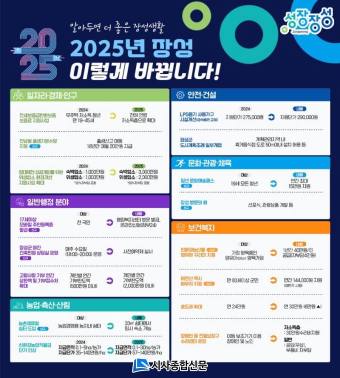 ¡®2025³â ´Þ¶óÁö´Â Á¦µµ¿Í ½ÃÃ¥¡¯Àº Á¤ºÎ‧µµ‧±º ½Å±Ô ÃßÁø‧º¯°æ »çÇ×À» ¡âÀÏÀÚ¸®‧°æÁ¦‧Àα¸ ¡â³ó¾÷‧Ãà»ê‧»ê¸² ¡â¹®È‧°ü±¤‧üÀ° ¡â¾ÈÀü‧°Ç¼³ ¡âº¸°Çº¹Áö ¡âÀϹÝÇàÁ¤ 6°³ ºÐ¾ß 43°³ Ç׸ñÀ¸·Î Á¤¸®ÇØ ¾Ë±â ½±°Ô ¼Ò°³Çϰí ÀÖ´Ù. ÀÌÁß ½Å±Ô»ç¾÷Àº 12°Ç, º¯°æ ÃßÁø 31°ÇÀÌ´Ù.