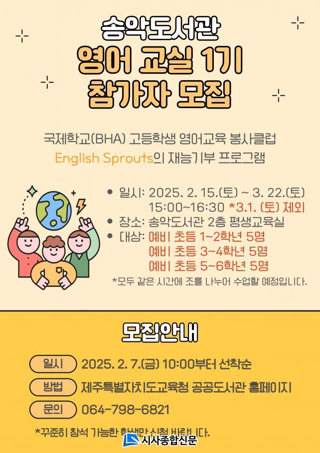 ¿µ¾î ±³½ÇÀº ±¹Á¦Çб³(BHA) Çлýµé·Î ÀÌ·ç¾îÁø ¿µ¾î ±³À° ºÀ»ç Ŭ·´ English Sprouts(ȸÀå Àå¼À±)ÀÇ Àç´É±âºÎ °ÀÇ·Î ÁøÇàµÈ´Ù.