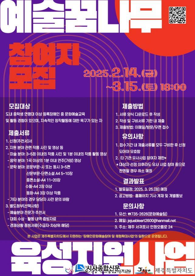 Á¢¼ö´Â ¹æ¹®, ¿ìÆí, À̸ÞÀÏ(jejuableart2600@hanmail.net)·Î °¡´ÉÇϸç, ¸ðÁý ±â°£ ³» ÇÊ¿ä ¼·ù°¡ ¸ðµÎ Á¦ÃâµÇ¾î¾ß À¯È¿ÇÏ´Ù. ÀÚ¼¼ÇÑ »çÇ×Àº º¹Áö°ü ȨÆäÀÌÁö(www.seogwicrc.or.kr) ¡®2025 ¿¹¼ú²Þ³ª¹«À°¼ºÁö¿ø»ç¾÷ ´ë»óÀÚ ¸ðÁý¡¯ °ø°í¸¦ Âü°í ¹Ù¶ó¸ç, ¹®ÀÇ »çÇ×Àº ¹®È¿¹¼úÆÀ(¢Ï735-2626)À¸·Î ¿¬¶ôÇÏ¸é µÈ´Ù.