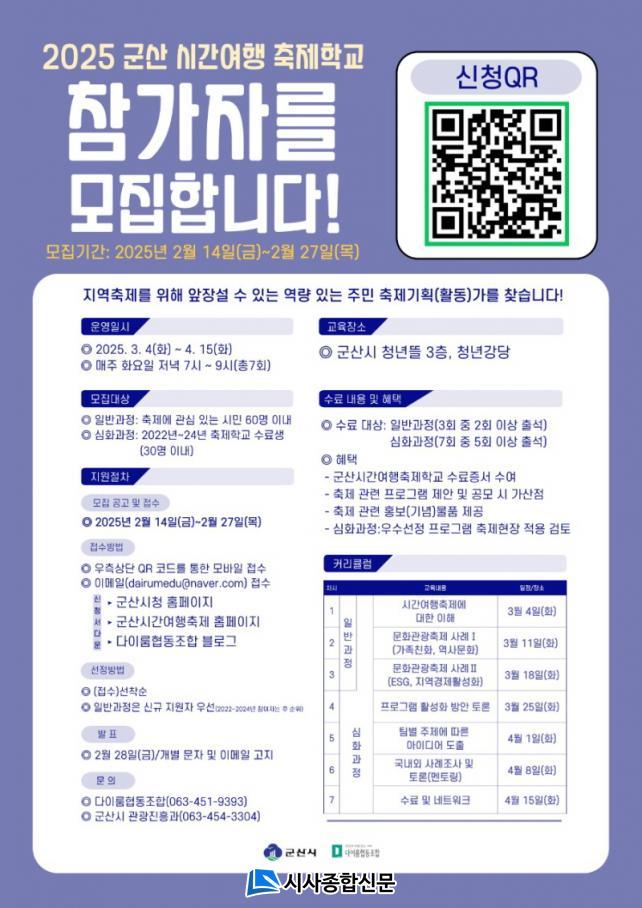 ½Åû ±â°£Àº 14ÀϺÎÅÍ 27ÀϱîÁöÀ̸ç, ±º»ê½Ã ´©¸®Áý ¹× ±º»ê½Ã°£¿©ÇàÃàÁ¦ ´©¸®Áý¿¡ °Ô½ÃµÈ Âü¿©ÀÚ ¸ðÁý ¸µÅ©¸¦ ÅëÇØ ¿Â¶óÀÎ ½ÅûÀÌ °¡´ÉÇÏ´Ù. ¶Ç´Â Âü¿©½Åû¼¸¦ ³»·Á¹Þ¾Æ ÀÛ¼º ÈÄ À̸ÞÀÏ(dairumedu@naver.com)·Î Á¦ÃâÇØµµ µÈ´Ù.