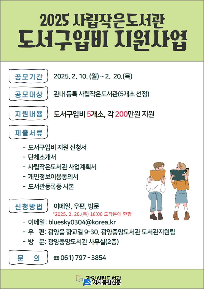 °ø¸ð±â°£Àº 2¿ù 10ÀϺÎÅÍ ¿À´Â 2¿ù 20ÀϱîÁö´Ù. Âü¿©¸¦ Èñ¸ÁÇÏ´Â »ç¸³ÀÛÀºµµ¼°üÀº ±¤¾ç½Ãû ¶Ç´Â ±¤¾ç½Ã¸³µµ¼°ü ´©¸®Áý °øÁö»çÇ׿¡¼ ½Åû¼·ù¸¦ ³»·Á¹Þ¾Æ ÀÛ¼ºÇÑ ÈÄ, ±¤¾çÁß¾Óµµ¼°üÀ» ¹æ¹®ÇØ Á¢¼öÇϰųª À̸ÞÀÏ(bluesky0304@korea.kr) ¶Ç´Â ¿ìÆí(±¤¾ç½Ã ±¤¾çÀ¾ Çâ±³±æ 9-30, ±¤¾çÁß¾Óµµ¼°ü µµ¼°üÁö¿øÆÀ)À¸·Î Á¦ÃâÇÏ¸é µÈ´Ù.