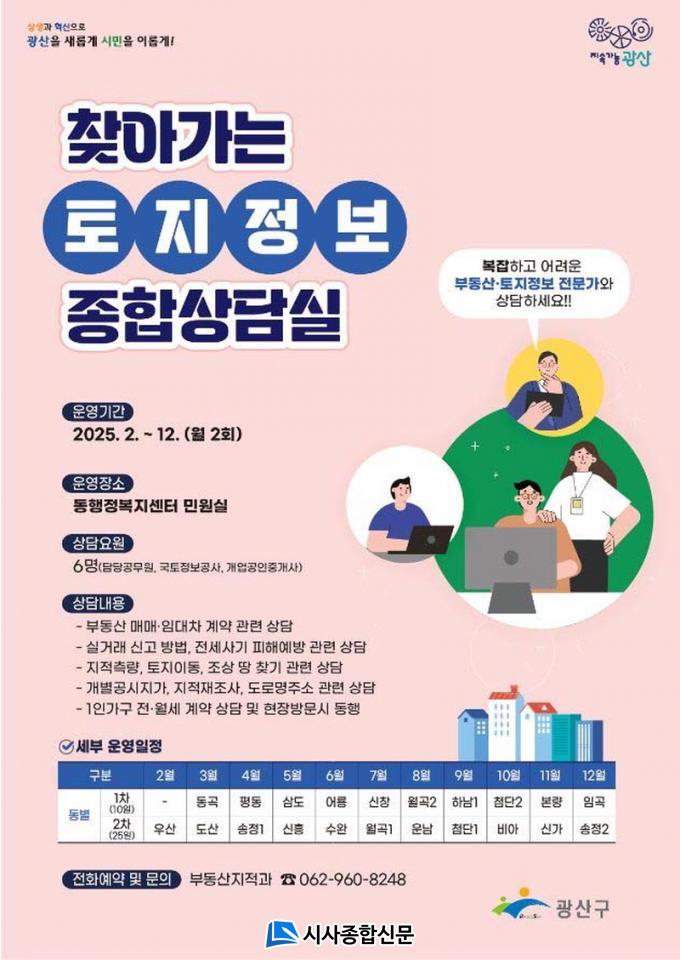 »ó´ã½ÇÀº ¸Å¿ù 10ÀÏ, 25ÀÏ¿¡ ¿¸®¸ç, µ¿ ÇàÁ¤º¹Áö¼¾ÅÍ ¹Î¿ø½Ç¿¡¼ ¿ùº°·Î »ó´ãÇϰí, µ¿º° ¿î¿µ ³¯Â¥´Â ±¤»ê±¸ ´©¸®ÁýÀ̳ª ±¤»ê±¸º¸¸¦ ÅëÇØ È®ÀÎÇÒ ¼ö ÀÖ´Ù. ÅäÁö Á¤º¸ Á¾ÇÕ»ó´ã½Ç¿¡ ´ëÇÑ ÀÚ¼¼ÇÑ ¾È³»´Â ±¤»ê±¸ ºÎµ¿»êÁöÀû°ú(062-960-8248)·Î ¹®ÀÇÇÏ¸é µÈ´Ù.