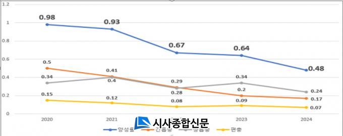 2024³â °Ç°°ËÁø ¼ö°ËÀÚ 111,444¸íÀ» ´ë»óÀ¸·Î ½Ç½ÃÇÑ ±â»ýÃæ °Ë»ç °á°ú, ¾ç¼ºÀÚ´Â ÃÑ 540¸í(0.48%)À¸·Î ³ªÅ¸³µ´Ù. ÀÌ´Â 2023³â °Ë»ç °á°ú(102,120¸í Áß 654¸í, 0.64%) ´ëºñ 0.16% °¨¼ÒÇÑ ¼öÄ¡À̸ç, ±¹³» ±â»ýÃæ ¾ç¼º·üÀº Áö¼ÓÀûÀ¸·Î ³·¾ÆÁö´Â Ãß¼¼¸¦ º¸À̰í ÀÖ´Ù.