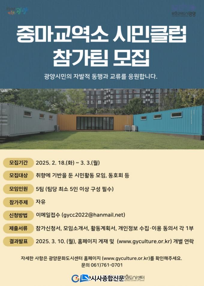 ¡®Á߸¶±³¿ª¼Ò ½Ã¹ÎŬ·´¡¯ Âü°¡ ½ÅûÀº 2¿ù 18ÀϺÎÅÍ 3¿ù 3ÀϱîÁö À̸ÞÀÏ(gycc2022@hanmail.net)À» ÅëÇØ Á¢¼öÇϸç, ¼·ù ½É»ç¸¦ °ÅÃÄ 3¿ù 10ÀÏ ÃÖÁ¾ ¼±Á¤ ÆÀÀ» ¹ßÇ¥ÇÒ ¿¹Á¤ÀÌ´Ù. Á¦Ãâ¼·ù µî ÀÚ¼¼ÇÑ ³»¿ëÀº ±¤¾ç½Ã ¹× ±¤¾ç¹®Èµµ½Ã¼¾ÅÍ È¨ÆäÀÌÁö(www.gyculture.or.kr)¿¡¼ È®ÀÎÇÒ ¼ö ÀÖ´Ù.