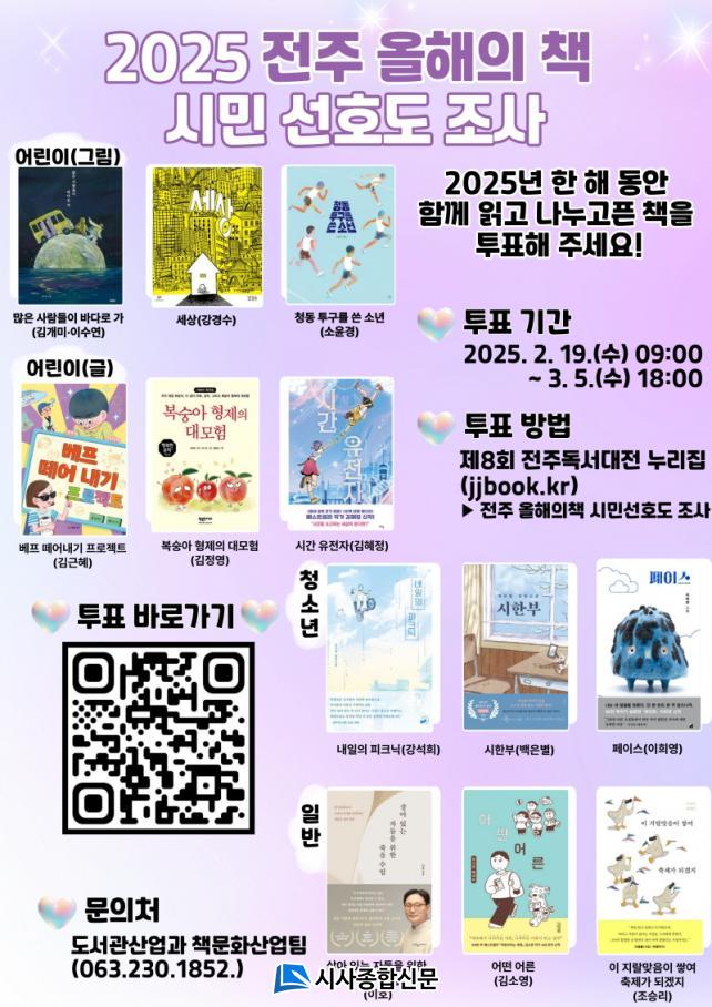 ½Ã¹Î ¼±È£µµ Á¶»ç´Â ¿Â¶óÀÎÀ¸·Î ÁøÇàµÇ¸ç, ÀüÁÖµ¶¼´ëÀü ´©¸®Áý(www.jjbook.kr)À» ÅëÇØ Âü¿©ÇÒ ¼ö ÀÖ´Ù. ½Ã´Â È帵µ¼ Áß ÃÖ´Ù µæÇ¥¸¦ ¹ÞÀº ºÎ¹®º° 1±Ç¾¿ ÃÑ 4±ÇÀ» ¡®2025 ÀüÁÖ ¿ÃÇØÀÇ Ã¥¡¯À¸·Î ÃÖÁ¾ ¼±Á¤ÇÒ °èȹÀÌ´Ù.