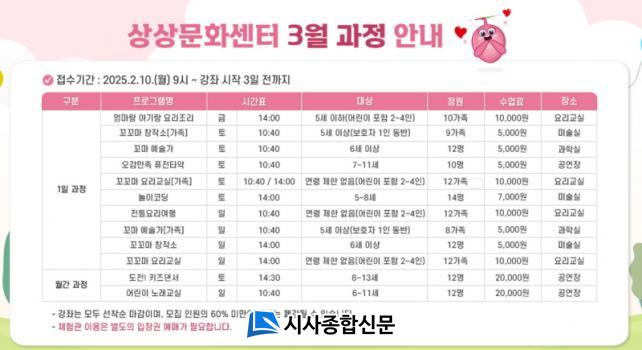 ¿ÃÇØ »ó»ó¹®È¼¾ÅÍ´Â ¡ã1ÀÏ °úÁ¤(10°³) ¡ã¿ù°£ °úÁ¤(2°³) ¡ã¹æÇРƯ°(¿©¸§¡¤°Ü¿ï) µîÀ¸·Î ±¸¼ºµÇ¸ç, âÀǷ°ú °¨¼ö¼ºÀ» Ű¿ï ¼ö ÀÖ´Â ´Ù¾çÇÑ Ã¼Çè Ȱµ¿À» Á¦°øÇÒ ¿¹Á¤ÀÌ´Ù.
