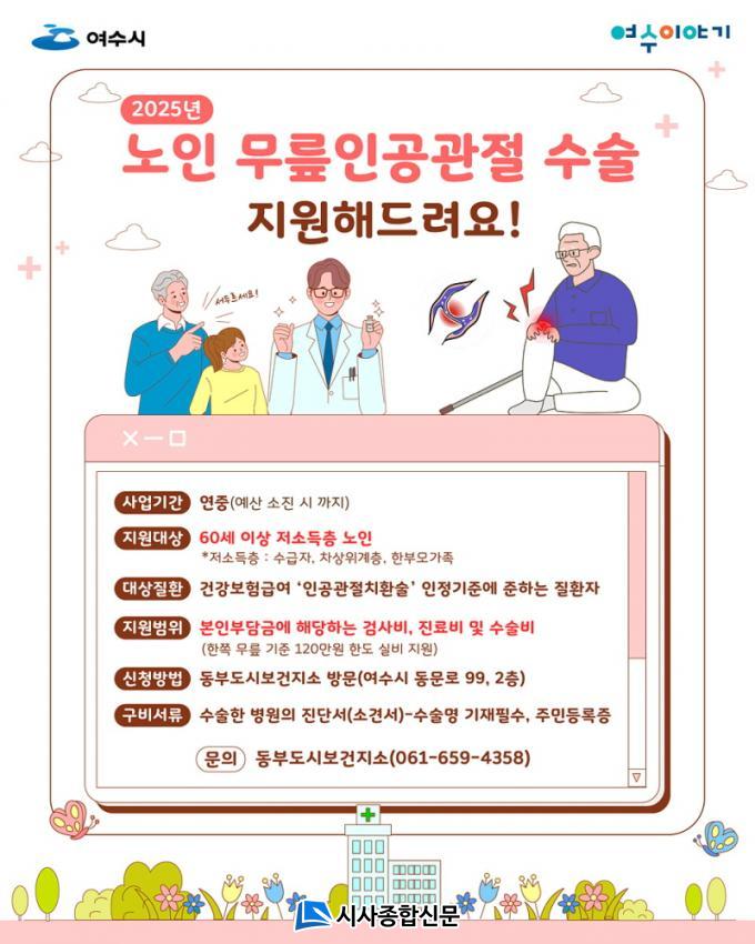 | ¿©¼ö½Ã(½ÃÀå Á¤±â¸í)°¡ Àú¼ÒµæÃþ ³ëÀÎÀ» ´ë»óÀ¸·Î ¹«¸Àΰø°üÀý ¼ö¼úºñ Áö¿ø»ç¾÷À» ½Ç½ÃÇÑ´Ù. |