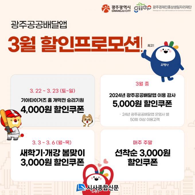 ¿ì¼± »õÇб⸦ ¸ÂÀÌÇØ ÆòÀÏÀÎ 3¿ù 3ÀϺÎÅÍ 6ÀϱîÁö 3000¿ø ÇÒÀÎÄíÆùÀ» Á¦°øÇÑ´Ù. ¸ÅÁÖ Åä‧ÀÏ¿äÀÏ Á¦°øÇÏ´Â 3000¿ø ÁÖ¸» ÇÒÀÎÄíÆù ÇýÅõµ À̾°í, ƯÈ÷ KIA ŸÀ̰ÅÁî Ȩ °³¸·Àü ±â°£ÀÎ 3¿ù 22Àϰú 23ÀÏ¿¡´Â ŸÀ̰ÅÁîÀÇ ½Â¸®¸¦ ±â¿øÇϸç ÃÖ´ë 4000¿ø±îÁö ÇÒÀÎÄíÆùÀ» Á¦°øÇÑ´Ù. ÀÌ¿¡ ´õÇØ Áö³ÇØ ±¤ÁÖ°ø°ø¹è´Þ¾ÛÀ» ¿î¿µ»çº° 50ȸ ÀÌ»ó ÀÌ¿ëÇÑ ¼ÒºñÀÚ¸¦ ´ë»óÀ¸·Î 5000¿ø °¨»ç ÄíÆùÀ» Áö±ÞÇÒ °èȹÀÌ´Ù.