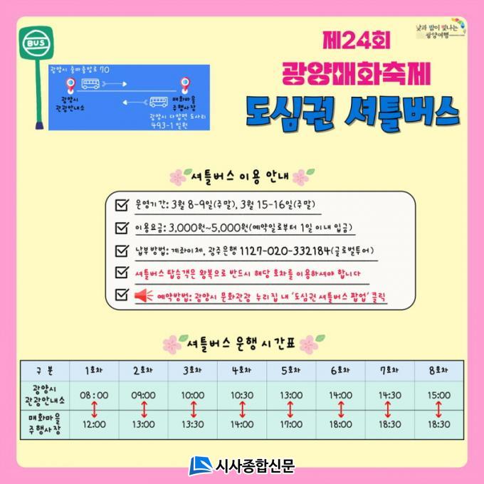 Á߸¶µ¿ ž½ÂÁö´Â ¡®±¤¾ç½Ã°ü±¤¾È³»¼Ò(±¤¾ç½Ã Á߸¶Áß¾Ó·Î 70)¡¯´Ù. ¿ÀÀü 8½ÃºÎÅÍ ¿ÀÈÄ 3½Ã±îÁö Æíµµ 8ȸ ¿î¿µµÇ¸ç, 1ÀϺÎÅÍ ±¤¾ç¹®È°ü±¤ ´©¸®Áý ÆË¾÷âÀ» ÅëÇØ ¿¹¾à °¡´ÉÇÏ´Ù.