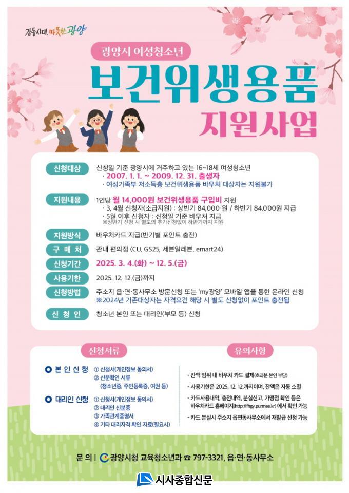 ±¤¾ç½Ã´Â À̹ø »ç¾÷À» ÅëÇØ ±¤¾ç½Ã¿¡ °ÅÁÖÇÏ´Â ¾à 2,200¸íÀÇ ¿©¼ºÃ»¼Ò³âÀÌ Áö¿øÀ» ¹ÞÀ» °ÍÀ¸·Î Àü¸ÁÇϰí ÀÖ´Ù. ¿©¼ºº¸°ÇÀ§»ý¿ëǰ Áö¿ø»ç¾÷¿¡ ´ëÇÑ ÀÚ¼¼ÇÑ »çÇ×Àº ±¤¾ç½Ã ±³À°Ã»¼Ò³â°ú(¢Ï061-797-3321) ¶Ç´Â ÁÖ¼ÒÁö À¾¡¤¸é¡¤µ¿ »ç¹«¼Ò·Î ¹®ÀÇÇÏ¸é µÈ´Ù.