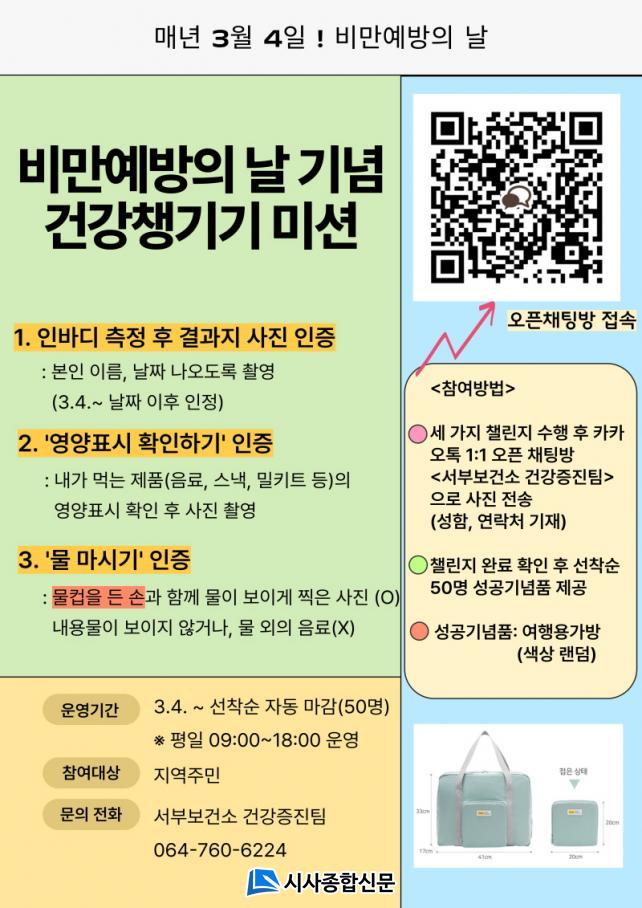 ¼ºÎº¸°Ç¼Ò´Â 3¿ù 4ÀϺÎÅÍ <ºñ¸¸¿¹¹æÀÇ ³¯ ±â³ä °Ç°Ã¬±â±â ¹Ì¼Ç>À» ¼öÇàÇϴ ç¸°Áö¸¦ ÁøÇàÇϸç, ÃÑ ¼¼ °¡ÁöÀÇ ¹Ì¼Ç ¡ãÀιٵð ÃøÁ¤ ÈÄ °á°úÁö »çÁø ÀÎÁõ ¡ã¡®¿µ¾çÇ¥½Ã È®ÀÎÇϱ⡯¡ãÇÏ·ç Àû´ç·®ÀÇ ¹° ¸¶½Ã±â¸¦ ´Þ¼ºÇÑ ¼±Âø¼ø 50¸í¿¡°Ô ¼ÒÁ¤ÀÇ »óǰÀÌ Á¦°øµÈ´Ù. Âü¿© ¹æ¹ýÀº īī¿ÀÅå ¿ÀÇ äÆÃ¹æ ¡®¼ºÎº¸°Ç¼Ò °Ç°ÁõÁøÆÀ¡¯À» ÅëÇØ °¡´ÉÇϸç Áö¿ªÁֹΠ´©±¸³ª Âü¿©ÇÒ ¼ö ÀÖ´Ù.