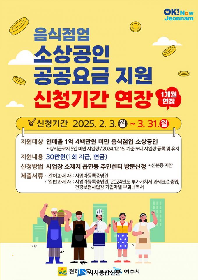 [½Ã»çÁ¾ÇսŹ® = ¿À½ÂÅà ±âÀÚ] ¿©¼ö½Ã(½ÃÀå Á¤±â¸í)´Â ¿µ¼¼ À½½ÄÁ¡¾÷ ¼Ò»ó°øÀÎÀ» ´ë»óÀ¸·Î ÁøÇà ÁßÀÎ °ø°ø¿ä±Ý Áö¿ø»ç¾÷ÀÇ Á¢¼ö ±â°£À» 3¿ù 31ÀϱîÁö 1°³¿ù ¿¬ÀåÇÑ´Ù°í ¹àÇû´Ù.