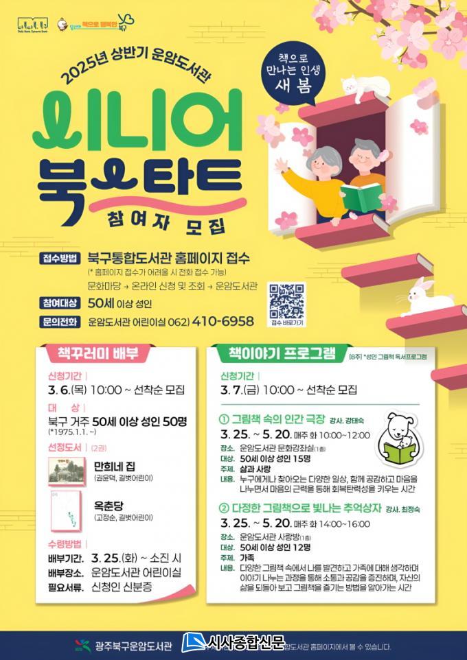 ¿î¾Ïµµ¼°ü(ºÏ±¸ ºÏ¹®´ë·Î 118)¿¡¼ ÁøÇàµÇ´Â À̹ø »ç¾÷Àº ¡®Ã¥À¸·Î ¸¸³ª´Â Àλý »õ º½¡¯À̶ó´Â ÁÖÁ¦·Î 50¼¼ ÀÌ»ó ºÏ±¸ Áֹο¡°Ô ¡®Ã¥ ²Ù·¯¹Ì¡¯¸¦ ¹èºÎÇÏ°í ¡®Ã¥ À̾߱â ÇÁ·Î±×·¥¡¯À» ¿î¿µÇÑ´Ù.