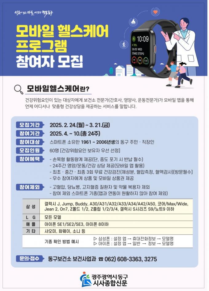 [½Ã»çÁ¾ÇսŹ® = ¿À½ÂÅà ±âÀÚ] ±¤ÁÖ µ¿±¸(ûÀå ÀÓÅÃ)´Â ÁֹεéÀÇ °Ç°ÇàÅ °³¼±°ú ÀÚ°¡ °Ç° °ü¸® ´É·Â Çâ»óÀ» À§ÇØ ¡®2025³â ¸ð¹ÙÀÏ ÇコÄÉ¾î »ç¾÷¡¯ Âü¿©ÀÚ 60¸íÀ» ¿À´Â 21ÀϱîÁö ¸ðÁýÇÑ´Ù°í ¹àÇû´Ù.