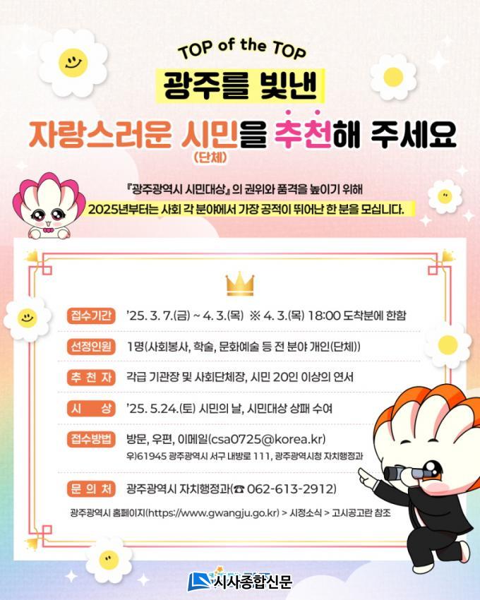 Á¢¼ö´Â 7ÀϺÎÅÍ 4¿ù3ÀϱîÁöÀ̸ç, ±¤Áֽà ÀÚÄ¡ÇàÁ¤°ú¿¡ ¹æ¹®Çϰųª ¿ìÆí, À̸ÞÀÏ(csa0725@korea.kr)·Î Á¢¼öÇÏ¸é µÈ´Ù.