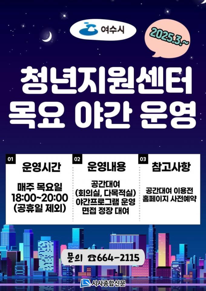| ¿©¼ö½Ã û³âÁö¿ø¼¾ÅͰ¡ ¸ÅÁÖ ¸ñ¿äÀÏ ¿ÀÈÄ 6½ÃºÎÅÍ 8½Ã±îÁö ¾ß°£ ¿î¿µÀ» °³½ÃÇÑ´Ù. |