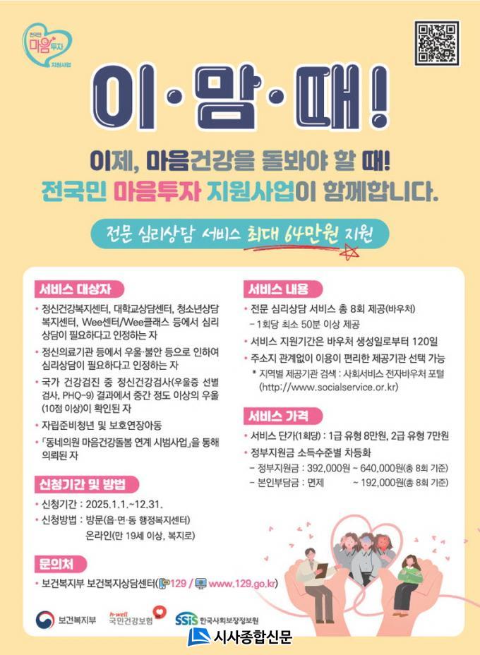 ´ë»óÀÚ¿¡°Ô´Â ÃÑ 8ȸ Àü¹®ÀûÀÎ 1´ë1 ´ë¸é ½É¸®»ó´ã ¼ºñ½º¸¦ ¹ÞÀ» ¼ö ÀÖ´Â ¹Ù¿ìó°¡ Á¦°øµÈ´Ù. ´ë»óÀÚ´Â ÁÖ¼ÒÁö¿Í °ü°è¾øÀÌ ÀÌ¿ëÀÌ Æí¸®ÇÑ ¼ºñ½º Á¦°ø±â°üÀ» ¼±ÅÃÇÒ ¼ö ÀÖ´Ù. ±¤Áֽÿ¡´Â 44°³ ±â°ü¿¡¼ ¼ºñ½º¸¦ Á¦°øÇϰí ÀÖ´Ù.