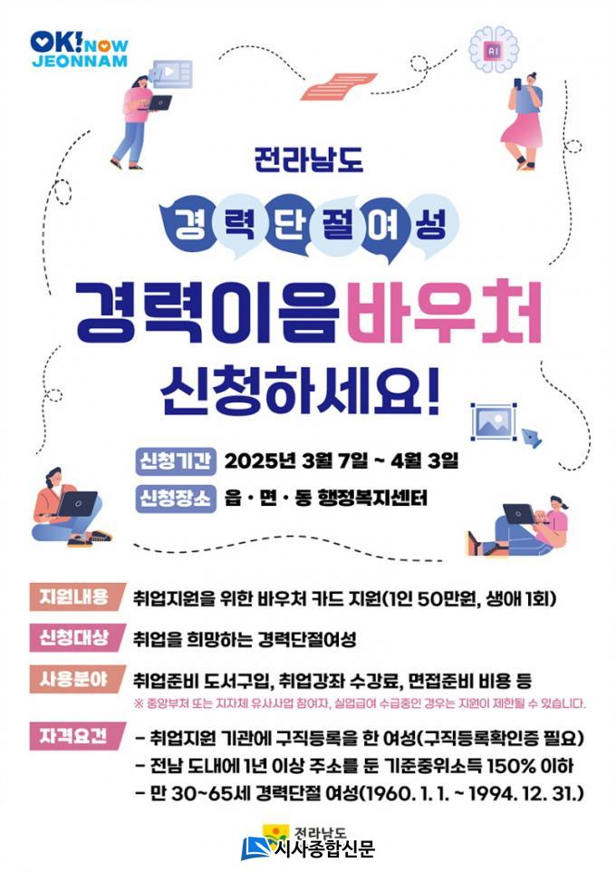 Áö¿ø ´ë»óÀº Ãë¾÷Áö¿ø±â°ü(¿©¼º»õ·ÎÀÏÇϱ⼾ÅÍ, °í¿ëº¹ÁöÇ÷¯½º¼¾ÅÍ µî)¿¡ ±¸Á÷À» µî·ÏÇÑ 30~65¼¼(1960³â 1¿ù 1ÀÏ~1994³â 12¿ù 31ÀÏ Ãâ»ýÀÚ) ¿©¼ºÀ¸·Î, ½ÅûÀÏ ±âÁØ Àü¶ó³²µµ¿¡ 1³â ÀÌ»ó ÁÖ¼Ò¸¦ µÎ°í, Àü¿ù °Ç°º¸Çè·á°¡ ±âÁØ ÁßÀ§¼Òµæ 150% ÀÌÇÏ¿©¾ß ÇÑ´Ù. ´Ù¸¸, ±âÁ¸ °æ·ÂÀÌÀ½¹Ù¿ìó ¶Ç´Â Çູ¹Ù¿ìó ¼öÇýÀÚ, ½Ç¾÷±Þ¿© ¼ö±ÞÀÚ, »ç¾÷ÀÚµî·ÏÁõ º¸À¯ÀÚ´Â Áö¿ø ´ë»ó¿¡¼ Á¦¿ÜµÈ´Ù.
