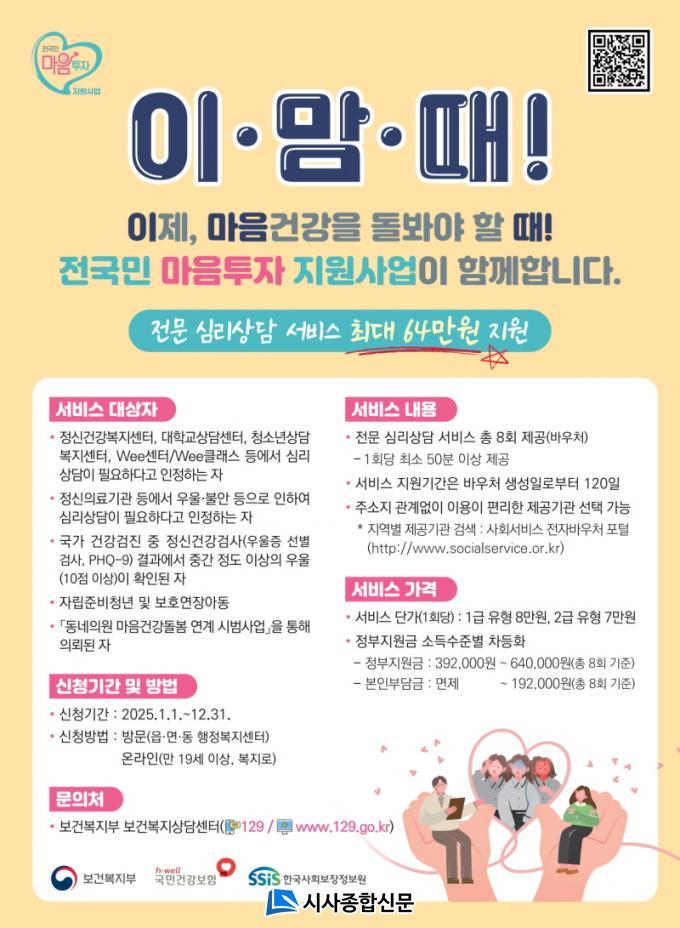 Áö¿ø´ë»óÀº ¡ãÁ¤½Å°Ç°º¹Áö¼¾ÅÍ, Á¤½ÅÀÇ·á±â°ü, û¼Ò³â»ó´ãº¹Áö¼¾ÅÍ, Wee¼¾ÅÍ µî¿¡¼ ½É¸®»ó´ãÀÌ ÇÊ¿äÇÏ´Ù°í ÀÎÁ¤ÇÏ´Â ÀÇ·Ú¼ ¶Ç´Â ¼Ò°ß¼¸¦ ¹ß±Þ¹ÞÀº ÀÚ ¡ã±¹°¡°Ç°°ËÁø¿¡¼ Áß°£ Á¤µµ ÀÌ»óÀÇ ¿ì¿ïÀÌ È®ÀÎµÈ ÀÚ ¡ãÀÚ¸³Áغñû³â ¹× º¸È£¿¬À徯µ¿ µîÀÌ´Ù.