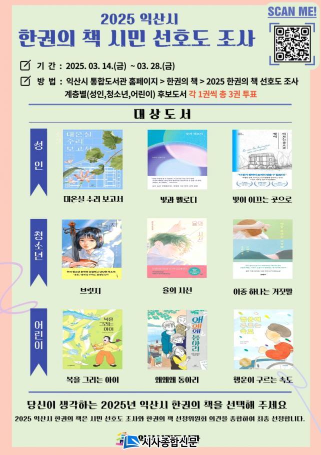 À̹ø ¼±È£µµ Á¶»ç´Â ÀÍ»ê½Ã¹Î ´©±¸³ª ÀÍ»ê½Ã ÅëÇÕµµ¼°ü ´©¸®Áý¿¡¼ Âü¿©ÇÒ ¼ö ÀÖ°í, Á¶»ç °á°ú¿Í ¼±Á¤À§¿øÈ¸ÀÇ ÀǰßÀ» Á¾ÇÕÇØ 2025³â 'ÇѱÇÀÇ Ã¥' ÃÖÁ¾ µµ¼°¡ È®Á¤µÈ´Ù.