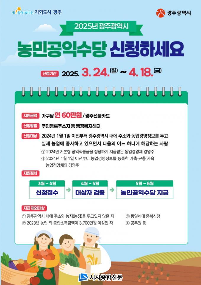 ¡®±¤ÁÖ ³ó¹Î°øÀͼö´ç¡¯Àº ¹Î¼± 8±â ÇÙ½É °ø¾àÀÎ ¡®3´ë °øÀͰ¡Ä¡ ¼ö´ç¡¯ Áß Çϳª·Î, Áö³ 2023³â ±¤¿ª½Ã ÃÖÃÊ·Î µµÀԵƴÙ. ±¤Áֽô 2023³â 7100³ó°¡¿¡ 42¾ï6000¸¸¿ø, 2024³â 8356³ó°¡¿¡ 50¾ï1400¸¸¿øÀÇ ³ó¹Î°øÀͼö´çÀ» Áö¿øÇß´Ù.