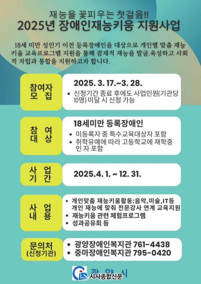 ±¤¾ç½Ã´Â Áö³ 2¿ù »ç¾÷À» ¼öÇàÇÒ ±â°üÀ» °ø¸ðÇØ ±¤¾ç½Ã ±¤¾çÀå¾ÖÀκ¹Áö°ü°ú ±¤¾ç½Ã Á߸¶Àå¾ÖÀκ¹Áö°üÀ» ¼±Á¤ÇßÀ¸¸ç, ¼öÇà±â°üÀº »ç¶÷Á߽ɰèȹ(PCP:Person Centered Planning)À» ±â¹ÝÀ¸·Î ¿Ã ¿¬¸»±îÁö ´Ù¾çÇÑ ÇÁ·Î±×·¥À» ÁøÇàÇÒ ¹æÄ§ÀÌ´Ù.