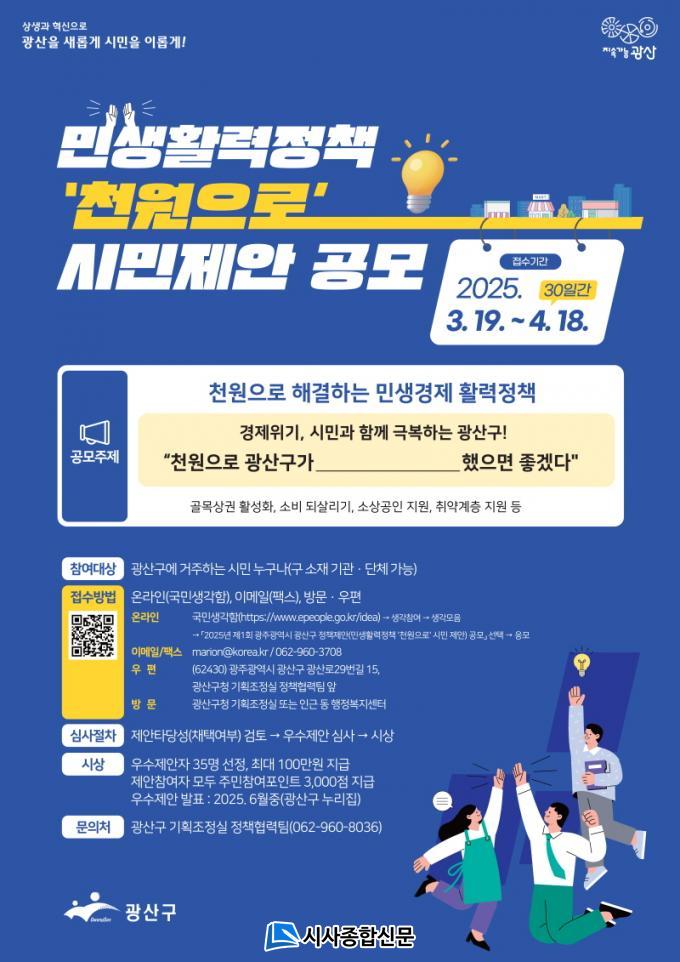 ±¤»ê±¸´Â 19ÀϺÎÅÍ 4¿ù 18ÀϱîÁö ¹Î»ý Ȱ·Â Á¤Ã¥ ¡®Ãµ¿øÀ¸·Î¡¯ ½Ã¹Î Á¦¾È °ø¸ðÀüÀ» ÁøÇàÇÑ´Ù°í ¹àÇû´Ù. ¹Î¼± 8±â ±¤»ê±¸°¡ ¿ªÁ¡ ÃßÁøÇϰí ÀÖ´Â ¡®Ãµ¿øÇѳ¢¡¯ »ç¾÷°ú °°ÀÌ Ãµ¿øÀ¸·Î ½Ã¹Î »î¿¡ µµ¿òÀ» ÁÙ ¼ö ÀÖ´Â Á¤Ã¥À» À§ÇÑ ½Ã¹ÎÀÇ Âü½ÅÇÑ ¾ÆÀ̵ð¾î¸¦ ¸ðÀ¸·Á´Â ÃëÁö´Ù.