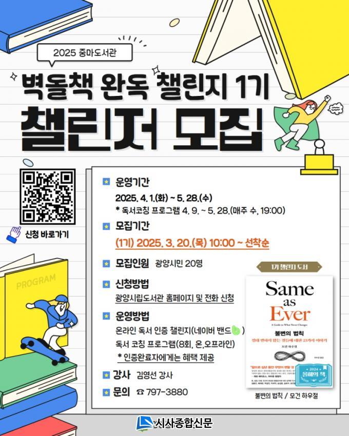 Âü¿© ½ÅûÀº 3¿ù 20ÀϺÎÅÍ ±¤¾ç½Ã¸³µµ¼°ü ´©¸®Áý(https://lib.gwangyang.go.kr) ¡æ µµ¼°ü ¼ºñ½º ¡æ µµ¼°ü °ßÇÐ ÅÇ¿¡¼ ½ÅûÀÌ °¡´ÉÇϸç, ÇÁ·Î±×·¥¿¡ ´ëÇÑ ÀÚ¼¼ÇÑ »çÇ×Àº ÀüÈ(¢Ï797-3880)·Î ¹®ÀÇÇϸé Ä£ÀýÇÑ ¾È³»¸¦ ¹ÞÀ»¼ö ÀÖ´Ù.