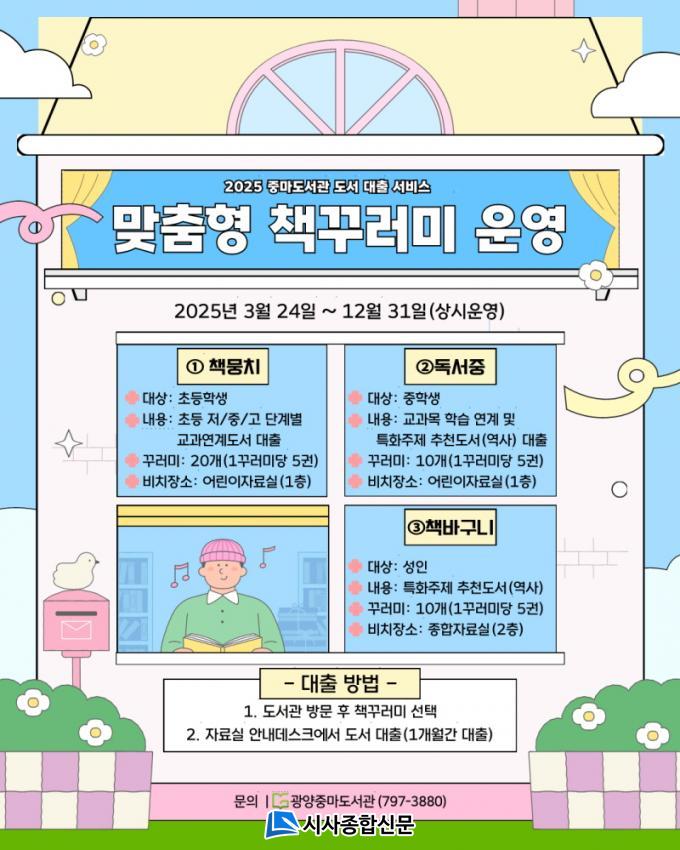 ¡®¸ÂÃãÇü Ã¥ ²Ù·¯¹Ì ¼ºñ½º¡¯¿¡ ´ëÇÑ ±Ã±ÝÇÑ »çÇ×Àº ±¤¾çÁ߸¶µµ¼°ü(¢Ï061-797-3880)À¸·Î ¹®ÀÇÇϸé ÀÚ¼¼È÷ ¾È³»¸¦ ¹ÞÀ» ¼ö ÀÖ´Ù.