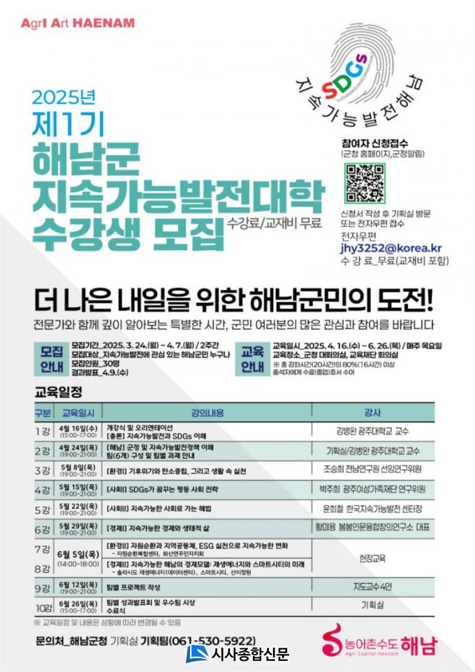 Á¦1±â ÇØ³²±º Áö¼Ó°¡´É¹ßÀü´ëÇÐÀÇ ¼ö°»ýÀº 4¿ù 7ÀϱîÁö ¸ðÁýÇÑ´Ù. ¿ÃÇØ óÀ½ °³¼³µÇ´ÂÇØ³²±º Áö¼Ó°¡´É¹ßÀü´ëÇÐÀº Áö¼Ó°¡´É¹ßÀü±³À° ÇÁ·Î±×·¥À» ÅëÇØ Áö¿ªÈ°µ¿°¡¸¦ ¾ç¼ºÇϰí, ¼ö·áÀÚ °£ ³×Æ®¿öÅ©¸¦ Çü¼ºÇØ Áö¼Ó°¡´É¹ßÀü Á¤Ã¥À» Áö¿ª»çȸ¿¡ È®»êÇϱâ À§ÇØ ¸¶·ÃµÆ´Ù.