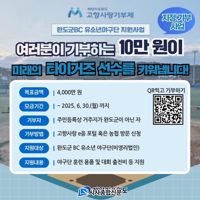 ÀÌ¿¡ 6¿ù ¸»±îÁö ¡¸¿Ïµµ±ºBC À¯¼Ò³â ¾ß±¸´Ü À°¼º Áö¿ø¡¹À» À§ÇØ ÁöÁ¤ ±âºÎ ¸ñÇ¥ ±Ý¾× 4õ¸¸ ¿øÀ» ¸ð±ÝÇϸç, ±âºÎ±ÝÀº ¾ß±¸ ²Þ³ª¹«µéÀÇ ÈÆ·Ã¿¡ ÇÊ¿äÇÑ °¢Á¾ Àåºñ ±¸ÀÔ, ´ëȸ Âü°¡ºñ µî¿¡ ¾²ÀÏ ¿¹Á¤ÀÌ´Ù.