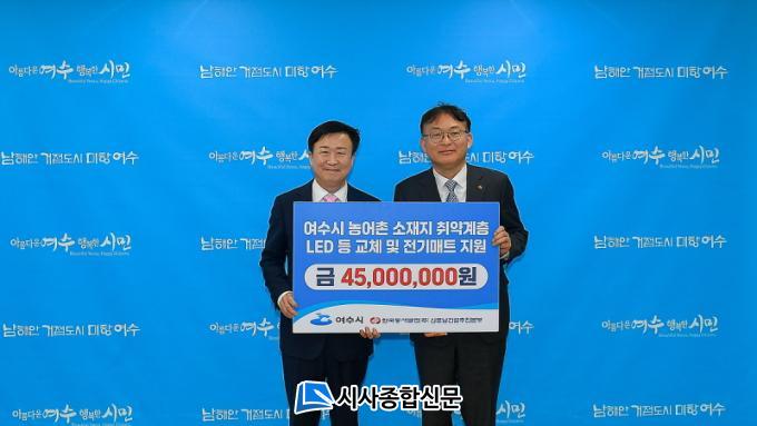 [½Ã»çÁ¾ÇսŹ® = ¿À½ÂÅà ±âÀÚ] ¿©¼ö½Ã(½ÃÀå Á¤±â¸í)´Â ÃÖ±Ù Çѱ¹µ¿¼¹ßÀü¢ß ½ÅÈ£³²°Ç¼³ÃßÁøº»ºÎ(º»ºÎÀå ±èűÔ)°¡ ³ó¾îÃÌ Áö¿ª Ãë¾à°èÃþÀ» À§ÇØ 4,500¸¸ ¿ø »ó´çÀÇ ¡®LED Àüµî ±³Ã¼ ¹× Àü±â¸ÅÆ®¡¯ ÈÄ¿øÁõ¼¸¦ Àü´ÞÇß´Ù°í ¹àÇû´Ù.