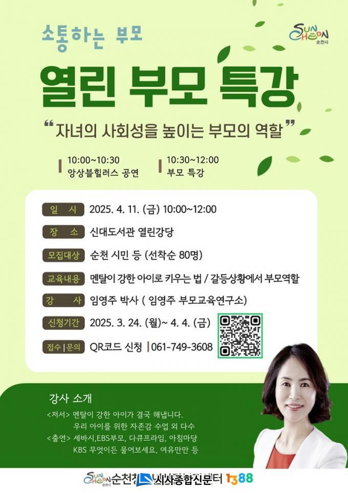 Âü°¡ ½ÅûÀº ºÎ¸ð, ÁöµµÀÚ µî ¼øÃµ½Ã¹ÎÀÌ¸é ´©±¸³ª ¹«·á·Î Âü¿©ÇÒ ¼ö ÀÖÀ¸¸ç, ³×À̹öÆû(https://naver.me/FMcNa14J) ¶Ç´Â QRÄÚµå ½ºÄµÀ» ÅëÇØ Á¢¼ö °¡´ÉÇÏ´Ù.
