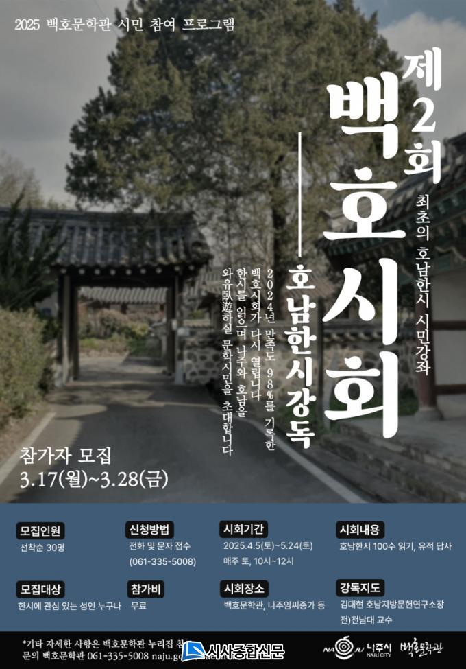 ¹éÈ£½Ãȸ Çѽÿ¡ °ü½ÉÀÌ ÀÖ´Â ¼ºÀÎ ´©±¸³ª ½ÅûÇÒ ¼ö ÀÖÀ¸¸ç Âü°¡ºñ´Â ¹«·á´Ù. ¿À´Â 3¿ù 28ÀϱîÁö ¹éÈ£¹®Çаü ´ëÇ¥ ÀüÈ·Î ½ÅûÇÏ¸é µÈ´Ù. ÃÑ30¸íÀ» ¸ðÁýÇϸç 10¸í ÀÌÇÏ ½Åû ½Ã¿£ °Á°¡ Ãë¼ÒµÉ ¼ö ÀÖ´Ù.