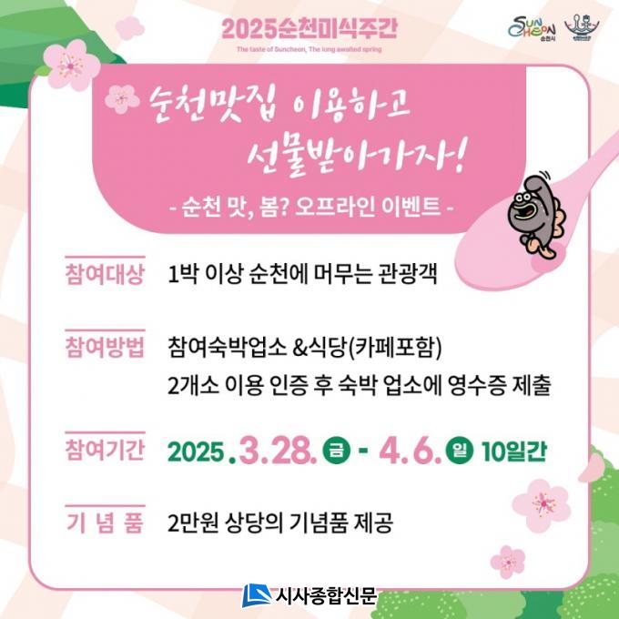 [½Ã»çÁ¾ÇսŹ® = Àå¹Î±Ô ±âÀÚ] ¼øÃµ½Ã(½ÃÀå ³ë°ü±Ô)´Â 2025¼øÃµ¹Ì½ÄÁÖ°£À» ¸Â¾Æ ¼øÃµÀ» ¹æ¹®ÇÏ´Â °ü±¤°´µé¿¡°Ô ¡®¼øÃµÀÇ ¸À¡¯À» µÎ ¹è·Î Áñ±æ ¼ö ÀÖ´Â ±âȸ¸¦ Á¦°øÇÏ´Â ¡°¼øÃµ¸ÀÁý ÀÌ¿ëÇÏ°í ¼±¹° ¹Þ¾Æ°¡ÀÚ!¡± À̺¥Æ®¸¦ ¿À´Â 28ÀϺÎÅÍ 4¿ù 6ÀϱîÁö ÁøÇàÇÑ´Ù°í ¹àÇû´Ù.