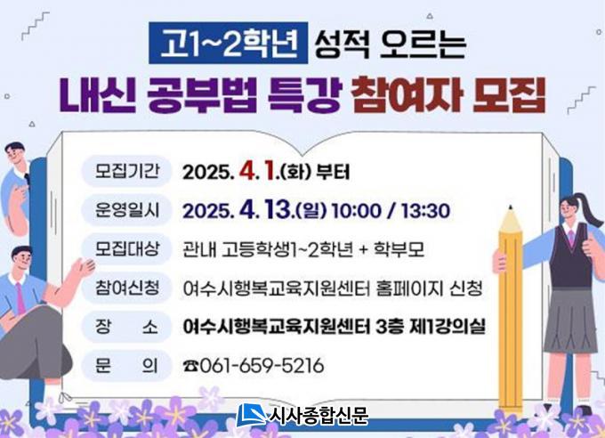 Ư°Àº 4¿ù 13ÀÏ(ÀÏ) ¿©¼ö½ÃÇູ±³À°Áö¿ø¼¾ÅÍ¿¡¼ ¿ÀÀü 10½Ã¿Í ¿ÀÈÄ 1½Ã 30ºÐ, ÃÑ 2ȸ¿¡ °ÉÃÄ 2½Ã°£¾¿ ÁøÇàµÈ´Ù. Âü¿©¸¦ Èñ¸ÁÇÏ´Â ÇлýÀº 4¿ù 1ÀÏ(È) ¿ÀÀü 9½ÃºÎÅÍ ¿©¼ö½ÃÇູ±³À°Áö¿ø¼¾ÅÍ ´©¸®Áý(www.yeosu.go.kr/edu)À» ÅëÇØ ½ÅûÇÏ¸é µÈ´Ù.