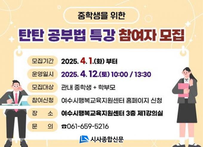 Ư°Àº 4¿ù 12ÀÏ(Åä) ¿©¼ö½ÃÇູ±³À°Áö¿ø¼¾ÅÍ¿¡¼ ¿ÀÀü 10½Ã¿Í ¿ÀÈÄ 1½Ã 30ºÐ, ÃÑ 2ȸ¿¡ °ÉÃÄ 2½Ã°£¾¿ ÁøÇàÇÑ´Ù. Âü¿©¸¦ Èñ¸ÁÇÏ´Â ÇлýÀº 4¿ù 1ÀÏ(È) ¿ÀÀü 9½ÃºÎÅÍ ¿©¼ö½ÃÇູ±³À°Áö¿ø¼¾ÅÍ ´©¸®Áý(www.yeosu.go.kr/edu)À» ÅëÇØ ½ÅûÇÏ¸é µÈ´Ù.